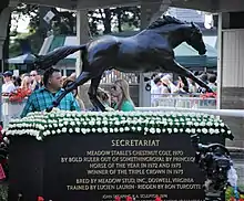Secretariat's finishing time in his 1973 Belmont victory (2 minutes, 24 seconds) set a world record for 1+1⁄2 miles (2.4 km) on dirt,[22] a world record which still stands. The 31-length victory clinched the first Triple Crown in 25 years, dating back to Citation in 1948. A statue of Secretariat is in the center of the Belmont paddock.