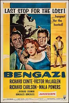 Bengazi is a 1955 American drama film directed by John Brahm and starring Richard Conte, Victor McLaglen, and Richard Carlson.[2] Several adventurers hunt for treasure in the desert near the Libyan town of Benghazi.