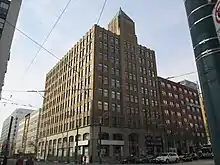 Balfour Building[2] 119 Spadina Ave at Adelaide St W, Fashion District, Toronto 1930 Art Deco style. Buff brick and carved limestone. Parapet with cubist fan patterns. Five Gothic-inspired, arched openings around the main entrance.