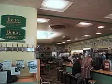 The interior was seemingly unchanged through the years. Its columns and walls were painted in bright greens and yellows with chrome siding, it had a stainless steel edged counter with rows of chrome counter stools, and terrazzo floors, laminate wall covering, and a ceiling with indirect lighting coves.[2] The chairs were bright yellow, orange and green. Walls were covered in photographs of celebrities who had dined at the restaurant; one spot was dubbed "Bens Wall of Fame". Bens employed only waiters, who wore a black bow tie and white buttoned shirt with black dress pants and shoes, along with a white waist apron.