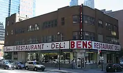 The restaurant was located at 990 De Maisonneuve Boulevard West, on the southeast corner of the intersection with Metcalfe Street. The three-storey brown brick building was designed in 1950 by Charles Davis Goodman, who as well designed the Jewish General Hospital and the Laurentian Hotel.[2] It was Bens third and final location, where it operated from 1949 until its closure 57 years later. The building had a rounded front corner facing, green awnings, large bay windows and a large illuminated wrap-around sign. The restaurant was on the ground floor and two upper floors were rented.