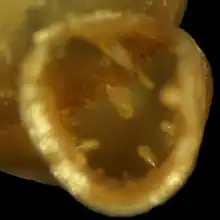 The width of the shell is 2 mm.[2] The aperture of the shell is protruded.[2] There are 13-15 denticles within the aperture about 400 μm from the lip.[2]