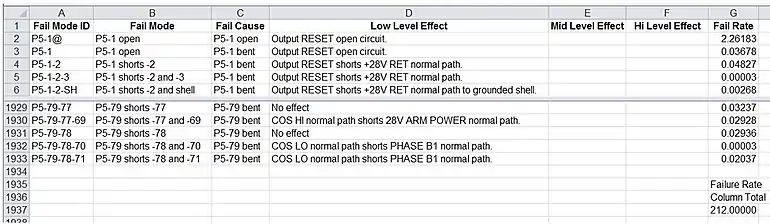 Figure 4 is a simplified sample of a typical FMEA worksheet for bent pin analysis. Additional columns of information may be added as shown in the separate article on FMEA. This sample is based on a format generated by a bent pin analysis software package and using data for a 79-pin connector. (Some columns of information have been removed from the original format to limit the table size for this article.) Information shown in the figure is derived from connector-related information as described above. Mid- and System ("Hi") level effect descriptions are not shown but would be supplied by human analysts. In cell A2 of this sample, “P5-1@” means that Pin 1 of connector P5 has opened a path due to causes other than bending. In cell A3, “P5-1” means that the Pin 1 path has been opened due to bending (but not touching anything else). While the effects of these two failure modes are the same, they are listed separately on the worksheet because their failure rates are different and reflect the fact that open path failures are far more likely than shorted path (bend-related) failures.[3] The failure rates in column G are per million hours and the sum of all failure rates equals the connector failure rate. (The individual failure rates are derived from the connector failure rate.)