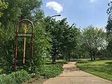 The area now comprising Benton Park proper was first used as the City Cemetery, from 1842–1865.[3] Those buried in the cemetery were relocated in 1865, and the neighborhood was created on June 25, 1866, by city ordinance.[4] The site of the park was originally 17 acres, but was reduced to 14 1/3 acres to accommodate perimeter streets. Noted horticulturist Edward F. Krausnick landscaped the park, incorporating a greenhouse, a footbridge, and two ponds. The park was used for botanical instruction and community activities and today is a popular recreational area.[3] Originally named City Park, the park was later renamed after Thomas Hart Benton, the first U.S. Senator representing the people of Missouri. As the neighborhood grew, it attracted several breweries due to its location above a system of caves that were ideal for beer storage, or "lagering" in German, as many of the popular German styles require. The caves maintain a constant 55 degree temperature that is ideal for beer storage. Today, all of the cave entrances are sealed. One such cave, the McHose & English Cave, is said to run underneath Benton Park to the Lemp Brewery, several blocks to the southeast.[3] The Lemp Brewery was one of the most notable of the city's breweries, which still stands today, although defunct.[5]
