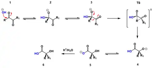 A hydroxide anion attacks one of the ketone groups in 1 in a nucleophilic addition to form the alkoxide 2. The next step requires a bond rotation to conformer 3 which places the migrating group R in position for attack on the second carbonyl group. In a concerted step, the migrating R group attacks the α-carbonyl group forming another alkoxide with concomitant formation of a keto-group at the other carbon. This migration step is rate-determining. This sequence resembles a nucleophilic acyl substitution. Calculations show that when R is methyl the charge build-up on this group in the transition state can be as high as 0.22 and that the methyl group is positioned between the central carbon carbon bond!