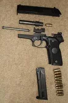 Beretta 8040 Cougar Pistol disassembled to show parts.