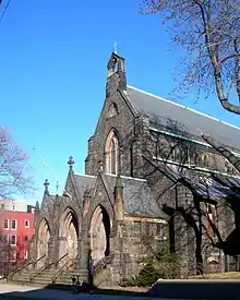 The Bergen Hill Historic District[7] received an opinion of eligibility for New Jersey Register of Historic Places designation (ID#1481) in 1991.[8] It includes Summit Avenue and side streets which feature a mix of late 19th/early 20th architecture that includes brick rowhouses, brownstones, Queen Anne style apartment buildings and private homes. At the foot of avenue is Library Hall, a renovated 1866 building, now residences.[9] It travels north to the landmark St. John's Episcopal Church[10] soon after coming in the neighborhood of the Beacon, site of the former Jersey City Medical Center which since 2005 is being renovated and restored for adaptive reuse. Lincoln High School is on Crescent Avenue which, as its name suggests, arcs the neighborhood as is crosses Communipaw.