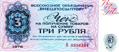 One chain belonged to the Vneshposyltorg (Foreign Mail Order Trade) and was intended for Soviet citizens who were paid some of their salary in foreign currency or received remittances from relatives or friends abroad. The foreign currency had to be exchanged for ruble-denominated Vneshposyltorg cheques, either by the recipient or by government intermediaries.