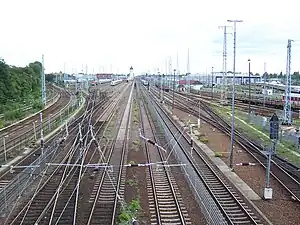 The freight yard was originally opened in 1867 to handle cattle. The construction of the existing yard commenced in 1875 when the Prussian state railways decided to build a marshalling yard to sort freight wagons using the new Ringbahn. It was opened on 1 September 1879 as the first railway yard of its kind in the Berlin area. For the first time sloping tracks were used for shunting.[4] A connection was built as a two-track line running from the yard to the west to the Ringbahn.