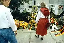 When Berlin was a divided city, the Berlin Wall ran along Bernauer Straße. The street itself belonged to the French sector of West Berlin and the East German authorities declared that the windows and doors that led out onto Bernauer Straße should be bricked up. In the early morning of 22 August 1961, Ida Siekmann was the first of 98 people to die while attempting to escape. She was living on the fourth floor of number 48 (third floor, 3te Stock, by German standards), threw bedding and some possessions down onto the street, and jumped out of the window of her apartment.[18][19][20] She fell on the sidewalk and was severely injured, dying shortly afterwards on her way to the Lazarus Hospital.[18][21]