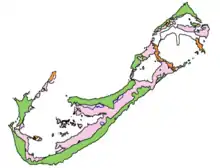The older eolianite ridges (older Bermuda) are more rounded and subdued compared to the outer coastline (Younger Bermuda). Thus, post deposition morphology includes chemical erosion, with inshore water bodies demonstrating that much of Bermuda is partially drowned Pleistocene karst. The Walsingham Formation is a clear example, constituting the cave district around Castle Harbour. The Upper Town Hill Formation forms the core of the Main Island, and prominent hills such as Town Hill, Knapton Hill, and St. David's Lighthouse, while the highest hills, Gibbs Hill Lighthouse, are due to the Southampton Formation.[53]