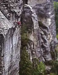 Bernd Arnold (born 28 February 1947) is a German rock climber and mountaineer. He is known for more than 900 first ascents in the East German Saxon Switzerland climbing region. During the 1970s and 1980s, he established most of the hardest routes in the region and became one of the most influential German climbers of his era. He is well-known for climbing barefoot, even on very hard routes.[1]