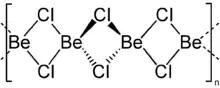 Two forms (polymorphs) of BeCl2 are known. Both structures consist tetrahedral Be2+ centers interconnected by doubly bridging chloride ligands. One form consist of edge-sharing polytetrahedra. The other form resembles zinc iodide with interconnected adamantane-like cages.[4] In contrast, BeF2 is a 3-dimensional polymer, with a structure akin to that of quartz.