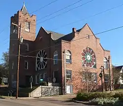 Bethel African Methodist Episcopal Church is a historic African Methodist Episcopal (A.M.E.) church located at 805 Monroe Street in Vicksburg, Mississippi. The church's congregation was established in 1864, making it the first A.M.E. church in the state. Its first church was a preexisting church building built in 1828; this was demolished to make way for the present building, which was completed in 1912. The church has a Romanesque Revival design with an auditorium plan, a common style for church buildings built in Mississippi at the time. The building features a four-story tower on the north side topped by a crenellated pyramid roof, stained glass rose windows on three sides, and a cross gabled roof with a corbelled parapet.[2]