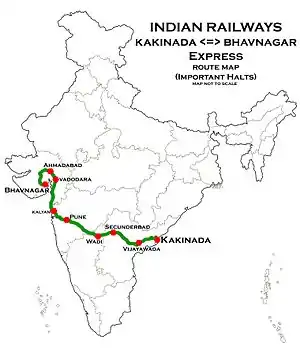The Bhavnagar Terminus–Kakinada Port Superfast Express is a Express train belonging to South Central Railway zone that runs between Bhavnagar Terminus and Kakinada Port in India. It is currently being operated with train numbers on a weekly basis.[1][2][3] From 18th March, 2023, it runs with highly refubrished LHB coaches.