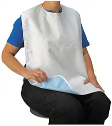 A bib is a garment worn hanging from the neck on the chest to protect clothing from accidentally spilled food. Bibs are frequently used by young children, especially infants, but also by some adults. Bibs are also worn when consuming certain "messy" foods. In addition, bibs are used for infants when they drool a lot, for example when they are teething.