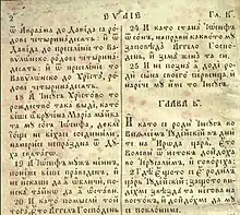 In 1852 Pavel Bozhigrobski printed the first four pages of the Konikovo Gospel in Solun.[10] In the original the language was not named, but in the version published by Bozhigrobski he calls it "Bulgarian".[11][12][13][14] The printed version was republished in transcription in 1917, 1922 and 1931 by Bulgarian researchers.