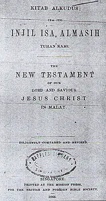 - ↑ "History of the Malay Bible – Alkitab". Bible Society of Malaysia. Retrieved 22 April 2019.