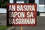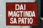 Clockwise from top-left: A signage barring people from hanging around the area; A signage barring vendors inside the churchyard; A signage reminding people of proper waste disposal; and a signage barring swimmers in Lake Bato. All are written in the Coastal Bikol language (Naga–Legazpi variant).