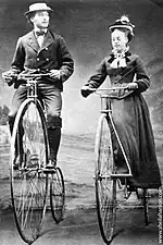 ![]() "Bicycling", a ca. 1887 color print showing one of the few ways in which it was socially acceptable for women to ride cycles, in the years before the invention of "safety bicycles" and the woman's "bicycle suit". |