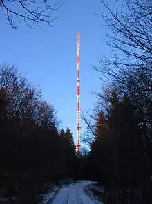 The Biedenkopf transmitter is a transmission tower owned by the Hessischer Rundfunk. It is located on the 673 meters (2,208 ft) high Sackpfeife mountain near the city of Biedenkopf in Hesse, just a few meters away from the border to North Rhine-Westphalia. It is used for radio and formerly TV broadcasting.