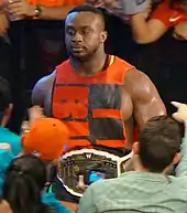 Big E entered the 2019 Royal Rumble, but was eliminated by Samoa Joe.[93] In the lead-up to WrestleMania 35, Big E's New Day teammate Kofi Kingston was attempting to earn a shot at the WWE Championship and after many attempts, WWE Chairman Vince McMahon granted him the title shot after Big E and Xavier Woods defeated Luke Gallows and Karl Anderson, Shinsuke Nakamura and Rusev, The Bar, The Usos, and Daniel Bryan and Erick Rowan in a tag team gauntlet match.[94] Shortly after WrestleMania, Big E suffered a legitimate knee injury which sidelined him for weeks.[95] He later returned and eventually earned another SmackDown tag team title opportunity at Extreme Rules. At the event, Big E and Xavier Woods defeated Daniel Bryan and Erick Rowan, and Heavy Machinery to win the titles (during this reign, Kingston was not recognized as champion as he was the reigning WWE Champion).[96] They lost the titles to The Revival at Clash of Champions,[97] but regained it on the November 8 episode of SmackDown, becoming record five-time champions as a team, and a record fifth reign for Big E individually (Woods is not recognized for this reign due to an injury).[98] At TLC: Tables, Ladders & Chairs, Big E and Kingston successfully defended the titles against The Revival in a ladder match.[99] On January 26, 2020, at the Royal Rumble, Big E participated in the Royal Rumble match but was eliminated by Brock Lesnar.[100]