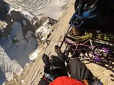 Big wall climbing can be performed as free climbing, however, it is common for big wall climbers to use some level of aid climbing on the route, as it is often impossible for very large multi-pitch routes to have a uniform level of difficulty (i.e. there may be some particularly difficult sections that are well beyond the difficulties of the rest of the route).[3] Most big wall routes require traditional climbing techniques for climbing protection however some routes have bolted sections (or pitons) like sport climbing routes. Big wall routes have also been free solo climbed.[1][2]