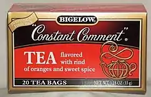 Constant Comment remains today one of Bigelow's most popular products. It is a black tea flavored with orange rinds and sweet spices.[4] The recipe was developed by interior designer Ruth Bigelow in 1945, from an old colonial tea recipe for making orange and spice flavored tea in stone containers.[5]