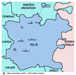 Its name derived from the Slavic word "bilje" ("herb" in English). In German the village is known as Belje, in Hungarian as Bellye,[4] and in Serbian Cyrillic as Биље. The area occupied by the municipality of Bilje is 260.15 km². [5]
