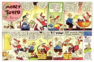 The daily Smokey Stover was not launched until November 14, 1938. Holman loved word play, and all of his features percolated with puns.[2] In his file cabinet, Holman kept thousands of puns. Readers of Smokey Stover often sent him puns, sometimes with accompanying illustrations.[6]