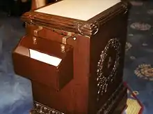 An original senate bill hopper dating from around 1817 is on display in the Old Senate Chamber. It is part of the collection of the Smithsonian Institution. The senate bill hopper had shelves as opposed to the 'bucket' shaped construction of the congressional hopper. The spaces between the shelves of the senate bill hopper shorten with height such that the top shelves are narrower than the bottom ones; it is believed that this is because so few bills became legally enacted.[1][4] A congressional bill hopper dating from the early 1950s is in the art collection of the House of Representatives; it was retired in 2004. It was situated next to the desk of the Clerk of the House of Representatives in the Chamber of the House of Representatives.[2]
