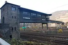 The Bingerbrück Kreuzbach (Bkb) signal box is located to the north of Bingen Hbf near the former southern hump of the marshalling yard. It is a gantry signal box, which increased the available room for operations by extending over the railway facilities. This signal box was designed by the architect Hans Kleinschmidt as a steel skeleton and was designed and completed in 1936. The western end of the building is built of broken stone. The actual signal tower is 15 metres long and in addition it has operating rooms and a pedestrian bridge. The interlocking system, which it housed, was a 10-metre-long electro-mechanical interlocking system of class E 43 made by the Siemens company. At its peak, the signal box was staffed by five people who were particularly responsible for the marshalling and operation of trains at the freight yard. In 1996, after 60 years of operations, the signal box, together with the other signal boxes, was removed from service and replaced by the central interlocking Bf on the Nahe bridge. The gantry signal box was listed as a historic landmark on 8 November 2005.[12] In addition, it is now one of the cultural monuments listed in the UNESCO World Heritage Site of the Upper Middle Rhine Valley.[13] After an inspection of the bridge carried out in 2006 found structural defects, access to the bridge was blocked. In April 2009, Bingen town council requested that the federal and state governments allocate funds for the preservation of the World Heritage Site towards the restoration of the signal box.