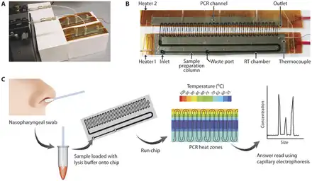 - ↑ Wanunu, Meni; Cao, Qingqing; Mahalanabis, Madhumita; Chang, Jessie; Carey, Brendan; Hsieh, Christopher; Stanley, Ahjegannie; Odell, Christine A.; Mitchell, Patricia; Feldman, James; Pollock, Nira R.; Klapperich, Catherine M. (2012). "Microfluidic Chip for Molecular Amplification of Influenza A RNA in Human Respiratory Specimens". PLOS ONE. 7 (3): e33176. Bibcode:2012PLoSO...733176C. doi:10.1371/journal.pone.0033176. ISSN 1932-6203. PMC 3310856. PMID 22457740.