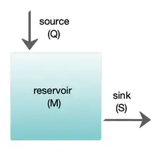 The diagram at the right shows a basic one-box model. The reservoir contains the amount of material M under consideration, as defined by chemical, physical or biological properties. The source Q is the flux of material into the reservoir, and the sink S is the flux of material out of the reservoir. The budget is the check and balance of the sources and sinks affecting material turnover in a reservoir. The reservoir is in a steady state if Q = S, that is, if the sources balance the sinks and there is no change over time.[25]