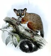 Bioko Allen's bushbaby (Sciurocheirus alleni), also known as the Bioko squirrel galago, is a species of primate in the galago family found in Cameroon, Nigeria, and the island of Bioko, Equatorial Guinea. Its natural habitat is subtropical or tropical dry forests.[2] The bushbaby is currently near-threatened, according to the International Union for Conservation of Nature.[2]