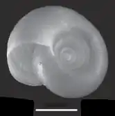 The shell of this species, like all planorbids is sinistral in coiling, but is carried upside down and thus appears to be dextral.
