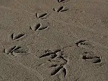 - ↑ Similar footprints, now lost, were reported from roughly contemporary strata in France in the 19th century: Buffetaut, Eric (2004). "Footprints of Giant Birds from the Upper Eocene of the Paris Basin: An Ichnological Enigma". Ichnos. 11 (3–4): 357. doi:10.1080/10420940490442287.