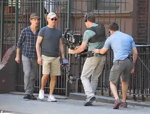 Once the logistics of the scenes were worked out and they had the timing down, the team headed to Kaufman Studios for more rehearsals, followed by principal photography based exclusively in New York during the spring of 2013.[40] The studios were used to film the backstage areas of the film, including Riggan's dressing room and the theatre corridors. St. James Theatre was used for two weeks; it was the location for the stage scenes.[41] The bar segments were shot in The Rum House on 47th Street,[42] and 43rd Street was used for the action-sequence.[43] The film was unable to be shot chronologically because of scheduling with the theatre.[44] Throughout the locations, including the studio, the scenes were lit with natural light,[lower-alpha 2] since Lubezki wanted the movie "to look as naturalistic as possible". The night-time scenes were possible to film in this way due to the brightness of New York.[29] Lubezki found lighting the scenes to be the hardest part of his work on the film. Not only did the lighting need to look realistic, but also had to be designed so that the continuous movements of the camera did not project the crew's shadows onto the actors.[28]