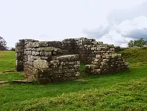 This western part of Hadrian's Wall was originally built using turf starting from 122 AD.[3] The stone fort was built some time after the wall, in the usual playing card shape, with gates to the east, west and south.