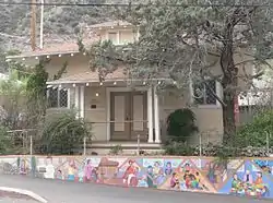 Descending Quality Hill Road, then passing briefly through the westernmost portion of the Bisbee Commercial Historic District, one comes to Quarry Canyon Road and the Higgins Hill neighborhood, containing mostly medium to large upper-class mostly frame houses on Quarry Canyon and the parallel Higgins Roads. Significant examples include an early architect's residence, the Hurst House, and a large, luxurious boarding house, both on Quarry Canyon. Continuing west into the Mason Hill neighborhood, significant examples on two parallel streets include the early Mason House, the Michael J. Brophy House, and a Craftsman style house, all on Oak Street, as well as the Coles/Overlock House on O'Hare Street. Near the top of Quarry Canyon Avenue, Roberts Avenue branches off to the right. Another public concrete stair descends from Roberts Avenue down to Tombstone Canyon Road. This stair negotiates a steeply pitched slope down to Perley Avenue, which provides sole access from its landing to a total of six houses. Returning along Quarry Canyon Avenue and then heading west on Tombstone Canyon Road, one passes by the south edge of the Tank Hill neighborhood, where a good example of box construction can be seen at 215 Tombstone Canyon. Proceeding west leads to a complex of buildings located on either side of a small sidecanyon between Tank Hill and Art Hill. Among these buildings are 225B Tombstone Canyon, a good example of the vernacular Pyramidal Cottage type, and a former Mormon Church, adaptively used as apartments. Moving further west, Art Avenue follows another very steep side-canyon on the north side, with WPA concrete street paving, and a closely-spaced cluster of frame and box-construction houses. Along the line of Art Hill Gulch well beyond the house cluster, there is a succession of five CCC/SCS-built rubble stone check dams, the uppermost of which carries a foot trail across the gulch. Moving back to the left side of Tombstone Canyon, one can see high concrete retaining walls, probably built by the WPA. Opposite these walls Garden Avenue forks right from Tombstone Canyon and runs parallel to it along the canyon floor, one of the few flat areas of Old Bisbee. Passing by 416 Garden, a two-story 20th century commercial building, which originally housed a neighborhood store downstairs and an apartment above, one can see its side bearing walls made of regionally produced, soft gypsum blocks. The top courses of these walls show a pattern of weathering erosion typical of this material.[5]
