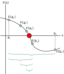 In mathematics, the bisection method is a root-finding method that applies to any continuous function for which one knows two values with opposite signs. The method consists of repeatedly bisecting the interval defined by these values and then selecting the subinterval in which the function changes sign, and therefore must contain a root. It is a very simple and robust method, but it is also relatively slow. Because of this, it is often used to obtain a rough approximation to a solution which is then used as a starting point for more rapidly converging methods.[1] The method is also called the interval halving method,[2] the binary search method,[3] or the dichotomy method.[4]