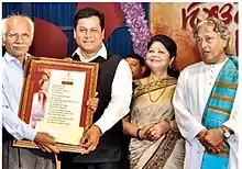 Hon'ble Chief Minister of Assam, along with Ustad Amjad Ali Khan (Right), presenting the Bishnu Rabha Award 2016 to Veteran Artist Girish Chandra Borah