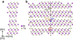 Bismuth telluride is a narrow-gap layered semiconductor with a trigonal unit cell. The valence and conduction band structure can be described as a many-ellipsoidal model with 6 constant-energy ellipsoids that are centered on the reflection planes.[4] Bi2Te3 cleaves easily along the trigonal axis due to Van der Waals bonding between neighboring tellurium atoms. Due to this, bismuth-telluride-based materials used for power generation or cooling applications must be polycrystalline. Furthermore, the Seebeck coefficient of bulk Bi2Te3 becomes compensated around room temperature, forcing the materials used in power-generation devices to be an alloy of bismuth, antimony, tellurium, and selenium.[5]