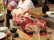 Bistecca alla fiorentina (beefsteak Florentine style) is an Italian steak dish made of young steer (vitellone) or heifer (scottona) that is one of the most famous dishes in Tuscan cuisine. It is loin steak on the bone cooked on a grill until rare (50 °C).