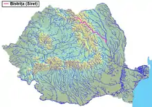 The Bistrița (Romanian pronunciation: [ˈbistrit͡sa] ⓘ; also called as Bistrița Aurie or Bistrița Moldoveană; Hungarian: Aranyos-Beszterce) is a river in the Romanian regions of Maramureș, Bukovina and Moldavia (most of its length). It is a right tributary of the river Siret.[1][2][3] At Chetriș, near Bacău, it flows into the Siret.[4] Its source is in the Rodna Mountains, at the foot of the Gârgalău Peak. It flows through the counties Bistrița-Năsăud, Suceava, Neamț, and Bacău. The towns Vatra Dornei, Bicaz, Piatra Neamț, Roznov, Buhuși, and Bacău lie along the Bistrița. The Bistrița is 283 km (176 mi) long, and its basin area is 7,039 km2 (2,718 sq mi).[2][5][6]