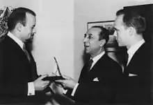 Weckström (left) receiving a jewelry design prize (Grand Prix of Rio de Janeiro 400 years celebration) from the Brazilian ambassador Vincente Paolo Gatti (middle). To the right, goldsmith Pekka Anttila.
