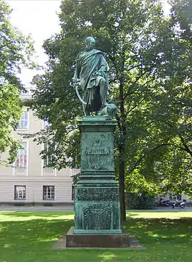 The Blücher Memorial on Bebelplatz green space in Berlin's Mitte district commemorates the Prussian field marshal and freedom fighter Gebhard Leberecht von Blücher (1742–1819). Created from 1819 to 1826 by Christian Daniel Rauch in neoclassical style, it is a masterpiece of the Berlin school of sculpture. Until 1950 the bronze statue stood at the front of Unter den Linden avenue, with which it formed an urban ensemble, and since 1963 it has stood at the back of the current location.[1]