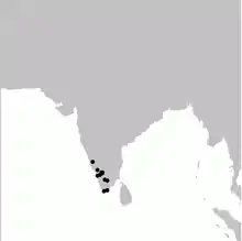 The main population of this bird is found in the high elevation plateaus above 1,500 m (4,900 ft) areas of the Nilgiris, Palani Hills, Biligiriranga Hills (Bellaji and Honnametti), and Kannan Devan Hills. They prefer areas with high leaf litter and undergrowth in open shola grassland habitats. The density was about 2.8 ha (6.9 acres) per pair during the breeding season. It is a highly parochial bird and no local movements other than dispersal of young has been noted.[6] To the north, it occurs in the Kudremukh National Park and the Bababudan Hills and south to the Ashambu Hills.[7] Some old records of the species from Maharashtra and Sri Lanka[8] have been considered dubious.[3][6]