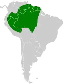 P. melanogaster is a low density species with an Amazonian distribution; it can be found in the upper parts of tropical rainforests and occasionally in savanna forests.[9] It prefers altitudes up to 800 meters above sea level. Is a native species of southern and eastern Guyana, Surinam, French Guiana, eastern Venezuela, Northern Bolivia, Colombia, Ecuador, eastern Perú and Brazil. It is a permanent resident in its range.[3][6]