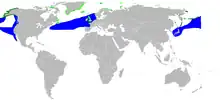 The black-legged kittiwake is a coastal bird of the arctic to subarctic regions of the world.[5] It can be found all across the northern coasts of the Atlantic, from Canada to Greenland as well as on the Pacific side from Alaska to the coast of Siberia.[6] Black-legged kittiwakes' wintering range extends further south from the St-Lawrence to the southern coast of New Jersey as well as in China, the Sargasso sea and of the coast of west Africa.[6][7] There are two subspecies of black-legged kittiwake. Rissa tridactyla tridactyla can be found on the Atlantic coast whereas Rissa tridactyla pollicaris is found on the Pacific coast.